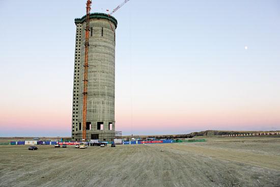由于尿素造粒塔造粒工藝需求,其塔頂高度普遍 較高,部分塔頂除塵裝置排放口距地面超過100m,且由于塔形結(jié)構(gòu),其頂部平臺空間小,檢修不便、風(fēng) 力載荷大。造粒工藝冷卻風(fēng)量較大,其每1萬t的年產(chǎn)能,對應(yīng)冷卻煙氣風(fēng)量為1.5萬~ 2.0萬m3/h。一 座40萬t/a規(guī)模的尿素造粒塔高溫天氣下冷卻風(fēng)量達 到80萬m3/h,較端高溫高濕情況下其冷卻風(fēng)量還可能更高。